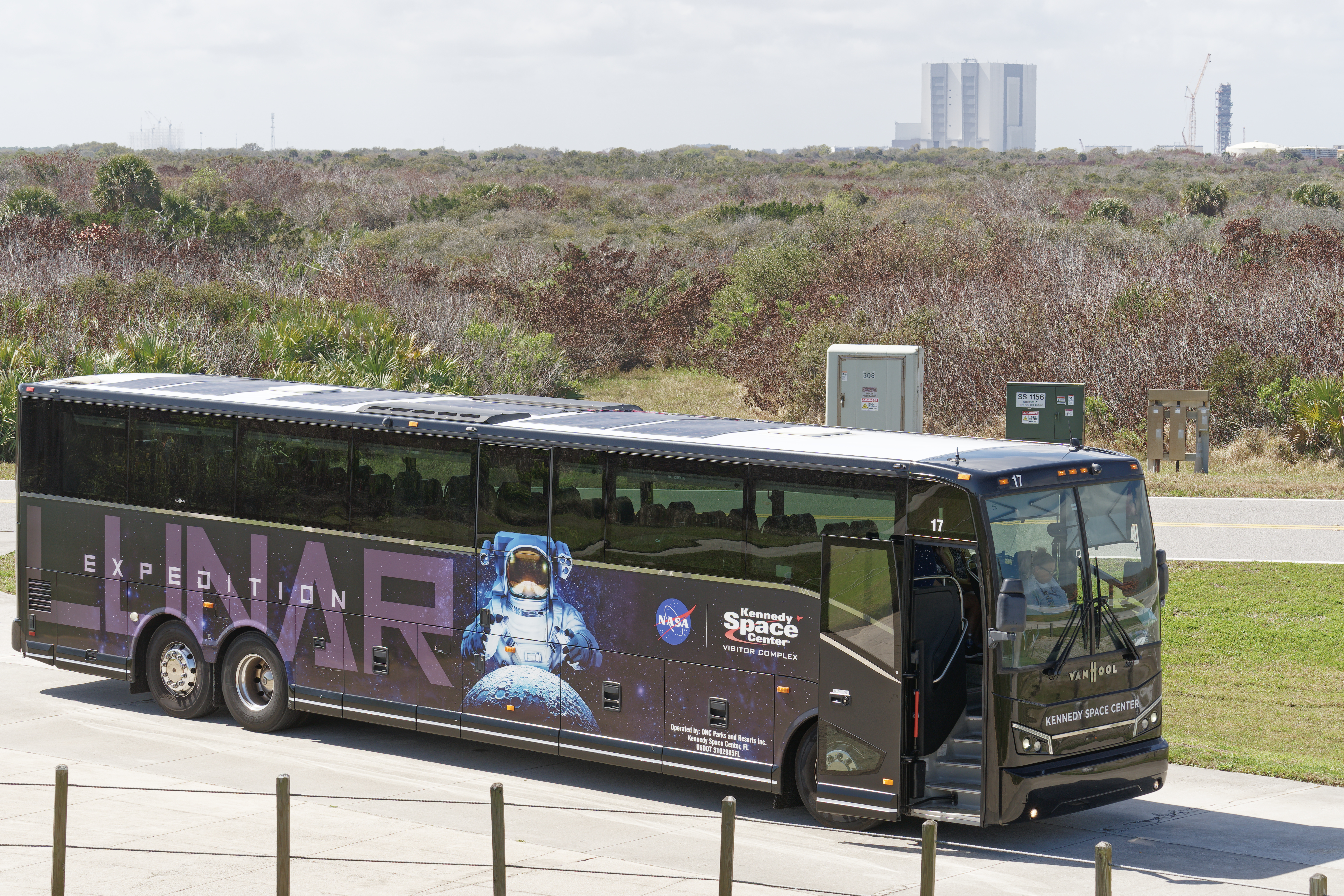| KSC Explore tour bus and the NASA vehicle assembly building in the background | Merritt Island, USA |